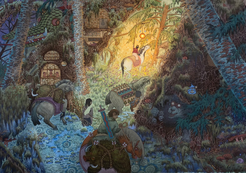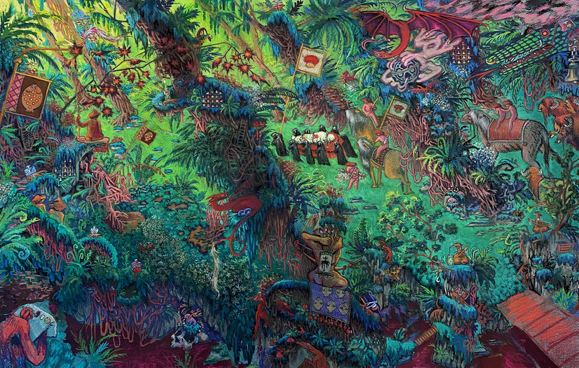 Bella Fasmer (b. 2001, Bergen) depicts complex worlds that reflect on the contemporary times we live in, while at the same time exploring more intimate and recognizable snapshots. A consistent theme in her artistry is the meeting between the fabulating and the everyday, whether in detailed watercolors of imaginative landscapes or in everyday motifs.